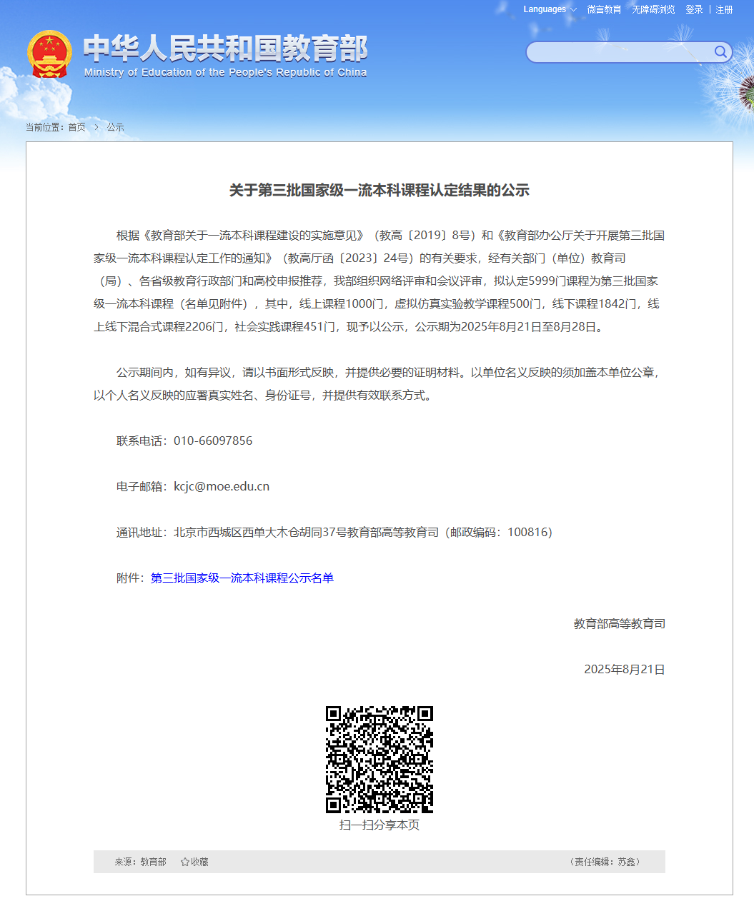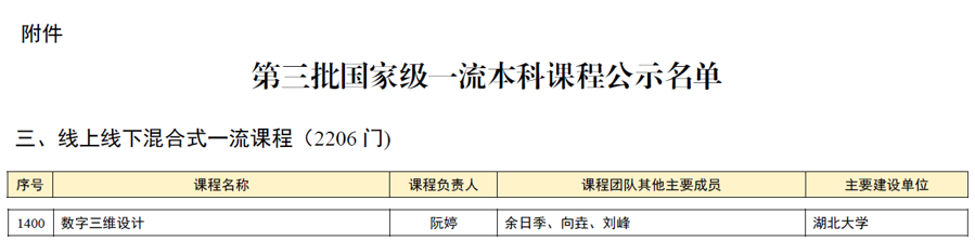 近日,在教育部高等教育司公布的“关于第三批国家级一流本科课程认定结果的公示”中,我院阮婷副教授主讲的《数字三维设计》课程,获批“线上线下混合式一流课程”。