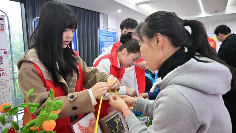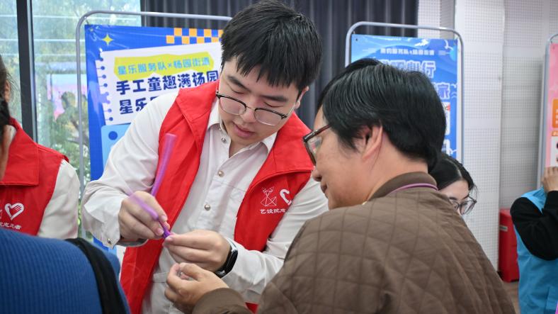 活动现场设有志愿服务体验区,由校、社志愿者联合开展免费理发、健康义诊、法律咨询、手工制作教学、趣味游戏等项目人气十足。其中,“艺术梦工厂”志愿服务团队带来的“扭扭棒”手工创意活动吸引了众多居民驻足参与,大家纷纷在志愿者指导下动手制作扭扭棒郁金香,现场气氛热烈。