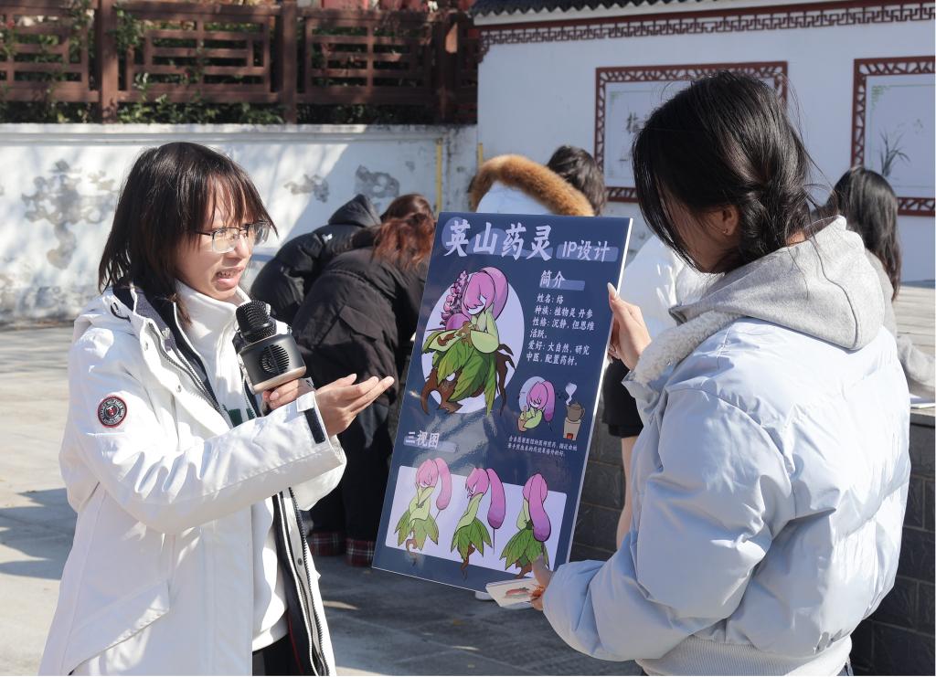 “分享·艺融英山”阶段,视传2303班开展英山乡村振兴主题设计成果分享会。学生以英山茶叶、山水、中草药等元素设计主题活动,依次展示为英山量身创作的设计作品“大美英山”邮票设计、“英山药灵”IP设计、“执笔英山”插画设计等。“《寻味英山魂》插画设计以英山红色底蕴与生态禀赋为核心,设计元素萃取烈士纪念馆、纪念碑等红色建筑的轮廓,融入大别山山脉雄浑肌理,同步打造天麻、茯苓、丹参三大中草药IP形象,将药材形态转化为灵动视觉符号,凸显英山特色。”学生们分享道。
