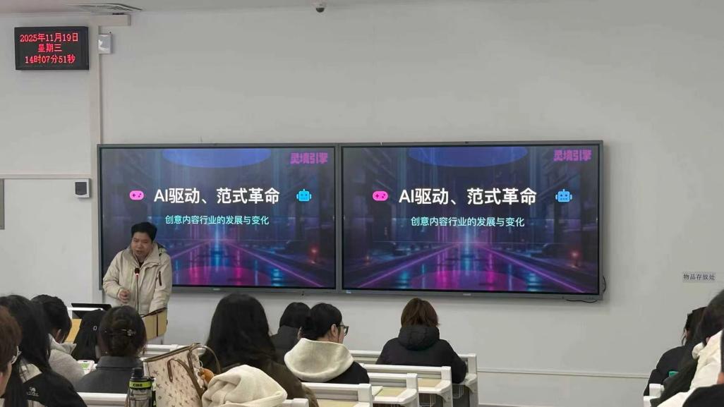 11月19日下午,williamhill威廉希尔邀请了灵境引擎团队——创始人、首席执行官张奥先生与首席技术官贺永贤先生走进课堂,为设计专业研究生带来一场聚焦数智时代设计变革的深刻分享。在讲座中,两位老师系统阐述了设计领域在人工智能、虚拟现实等前沿技术驱动下的变革趋势与新兴实践,指出了设计师的工作内容、技能结构与协作方式正在经历前所未有的重塑,展示了未来设计职业的“全链路”工作范式。