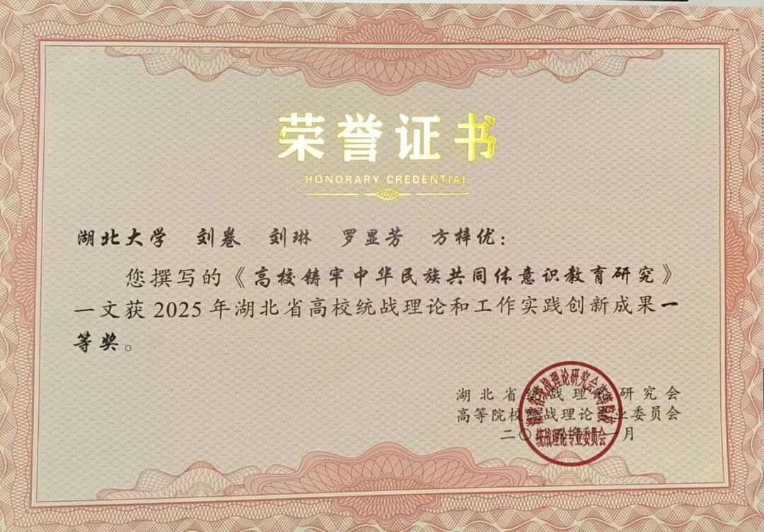 11月6日,湖北省高校统战理论研究会第40次学术年会在长江大学召开,会上表彰了2025年度湖北省高校统战理论和工作实践创新成果奖项。我校williamhill威廉希尔刘卷教授(湖北省高校“双带头人“教师党支部书记)与视觉传达设计专业方向硕士研究生刘琳、罗显芳、方梓优的论文《高校铸牢中华民族共同体意识教育研究》荣获一等奖。
