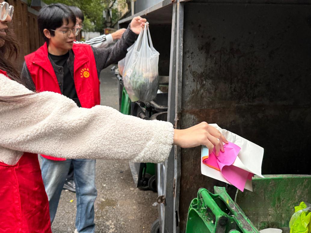 剪纸活动接近尾声,桌上不可避免地留下了一些创作过程中产生的废弃物——碎纸片、废纸板、使用过的胶水瓶、包装袋等。此时,活动自然过渡到了“垃圾分类”环节。志愿者们巧妙地将环保实践融入文化体验的收尾工作,引导大家将目光投向这些“剩余物”。“大家看,我们剪纸剩下的这些红纸屑,属于什么垃圾呀?”志愿者举起收集盘,用通俗易懂的语言讲解着垃圾分类知识。“