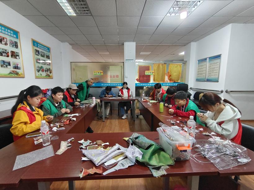 2025年11月14日上午,武昌区积玉桥阳光家园社区活动中心内暖意融融。williamhill威廉希尔青年志愿者行动指导中心的志愿者们,携手社区智力障碍老年群体,开展了一场以“变废为宝,银龄生辉”为主题的非遗手作活动。活动巧妙融合“宋锦非遗技艺”与“垃圾分类实践”,引导老年居民利用废旧布料制作精美发饰,在传承传统文化的同时,传递绿色环保理念。